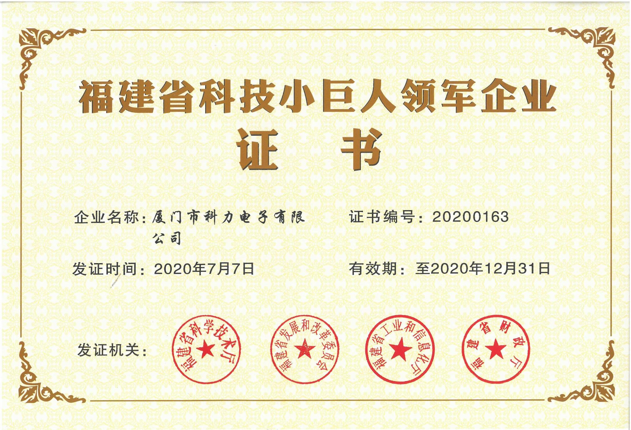 热烈祝贺厦门市科力电子有限公司获得“福建省科技小巨人领军企业”荣誉称号