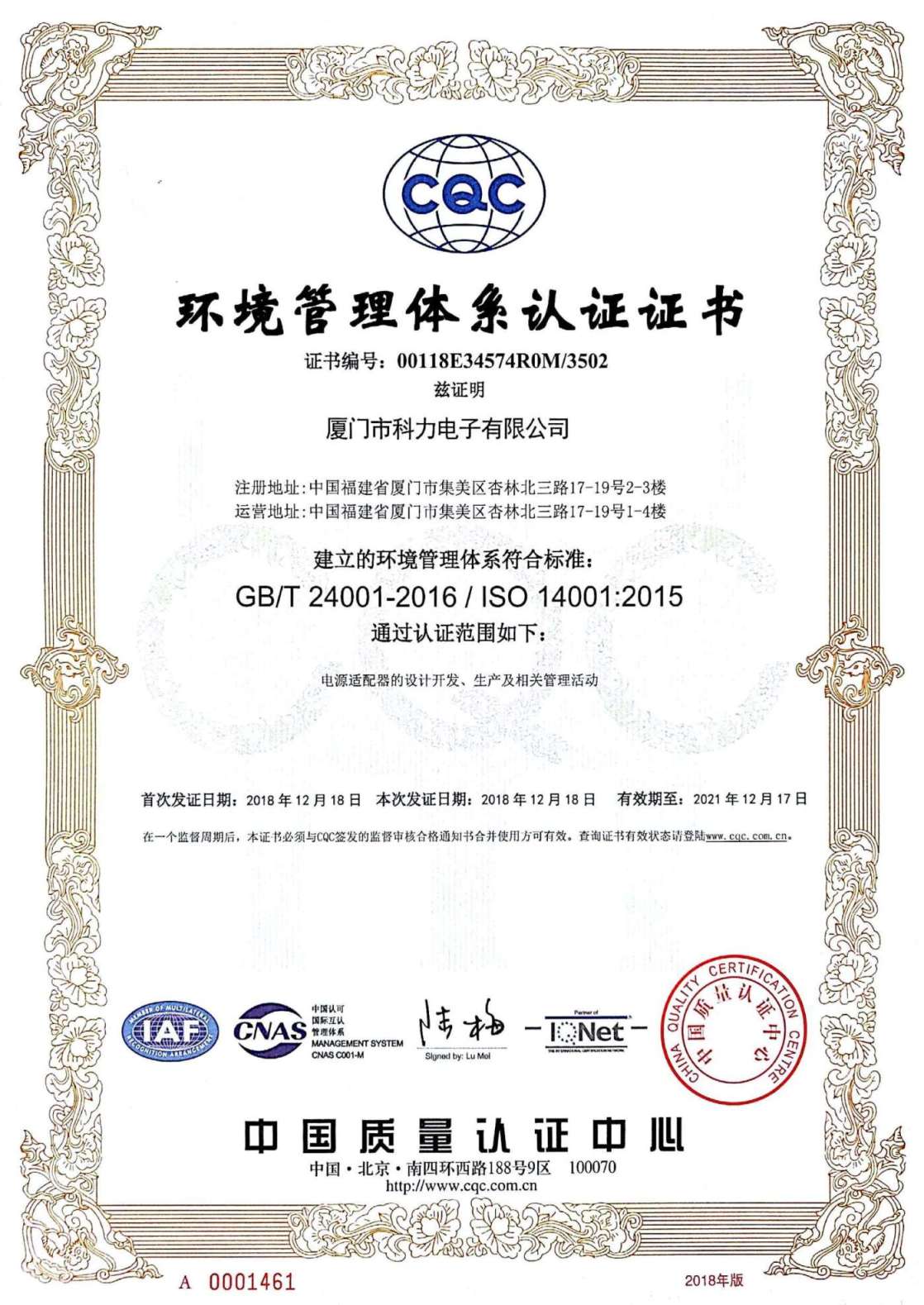 热烈祝贺公司2018年12月获得“ISO14000环境管理体系认证证书”