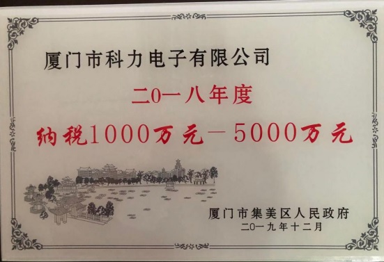 同时,公司积极全力的履行社会责任,回报政府及社会各界的支持与厚爱,2018年度纳税突破千万元以上,获得了集美区颁发的“2018年度纳税1000万元-5000万元”荣誉!