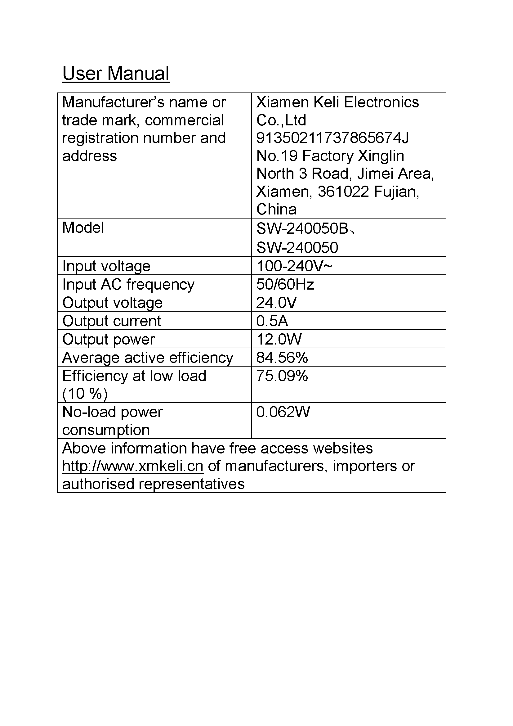 ERP information of production-23UM_ERP说明书 24.0V0.5A(2019.12.30)